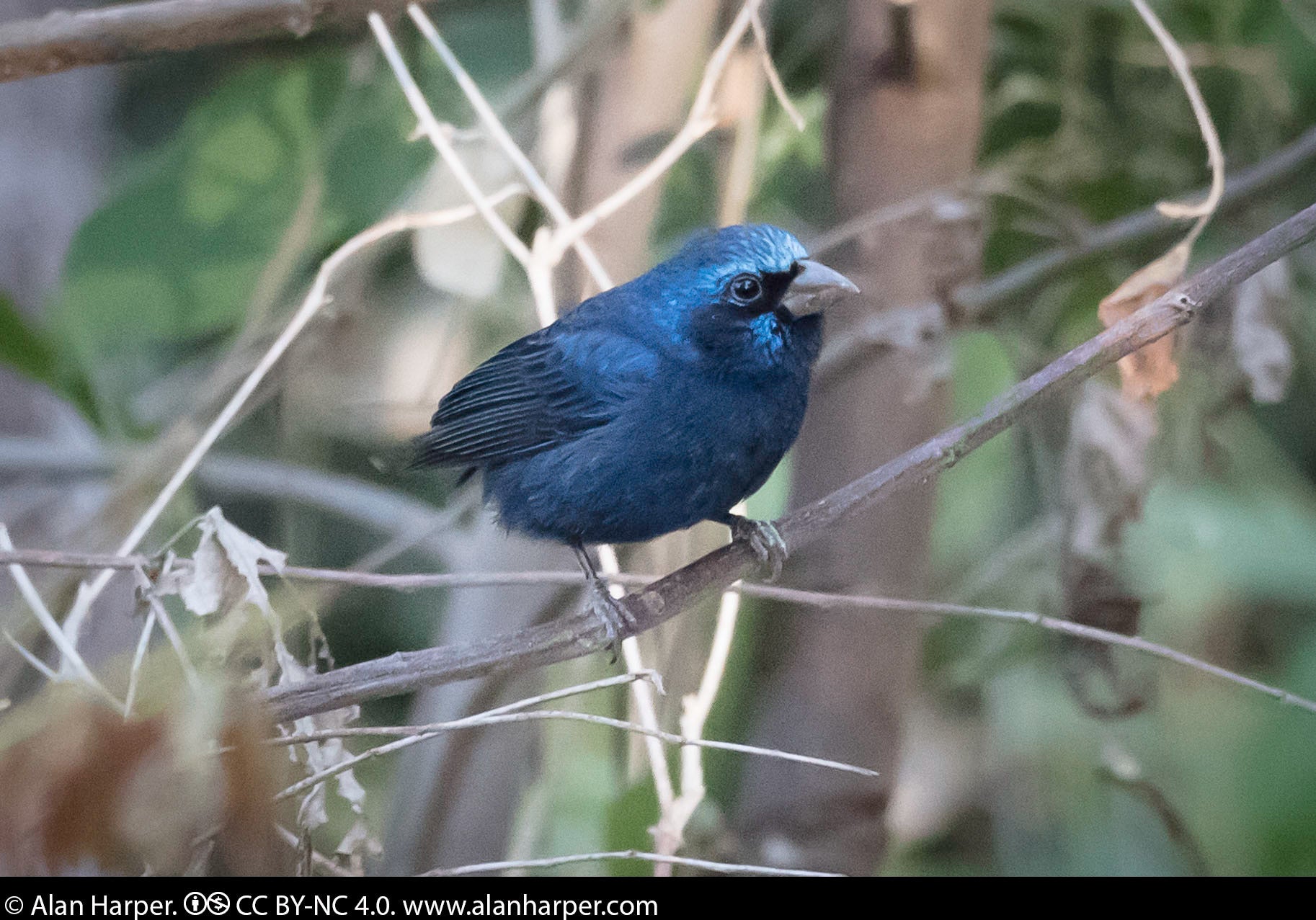In dense thickets and woodland edges of Mexico and northern Central America, this dark bunting is fairly common. In our area it is a rare and irregular visitor to far southern Texas, mostly occurring in winter. It has very rarely strayed farther up the Texas coast, once reaching Louisiana.